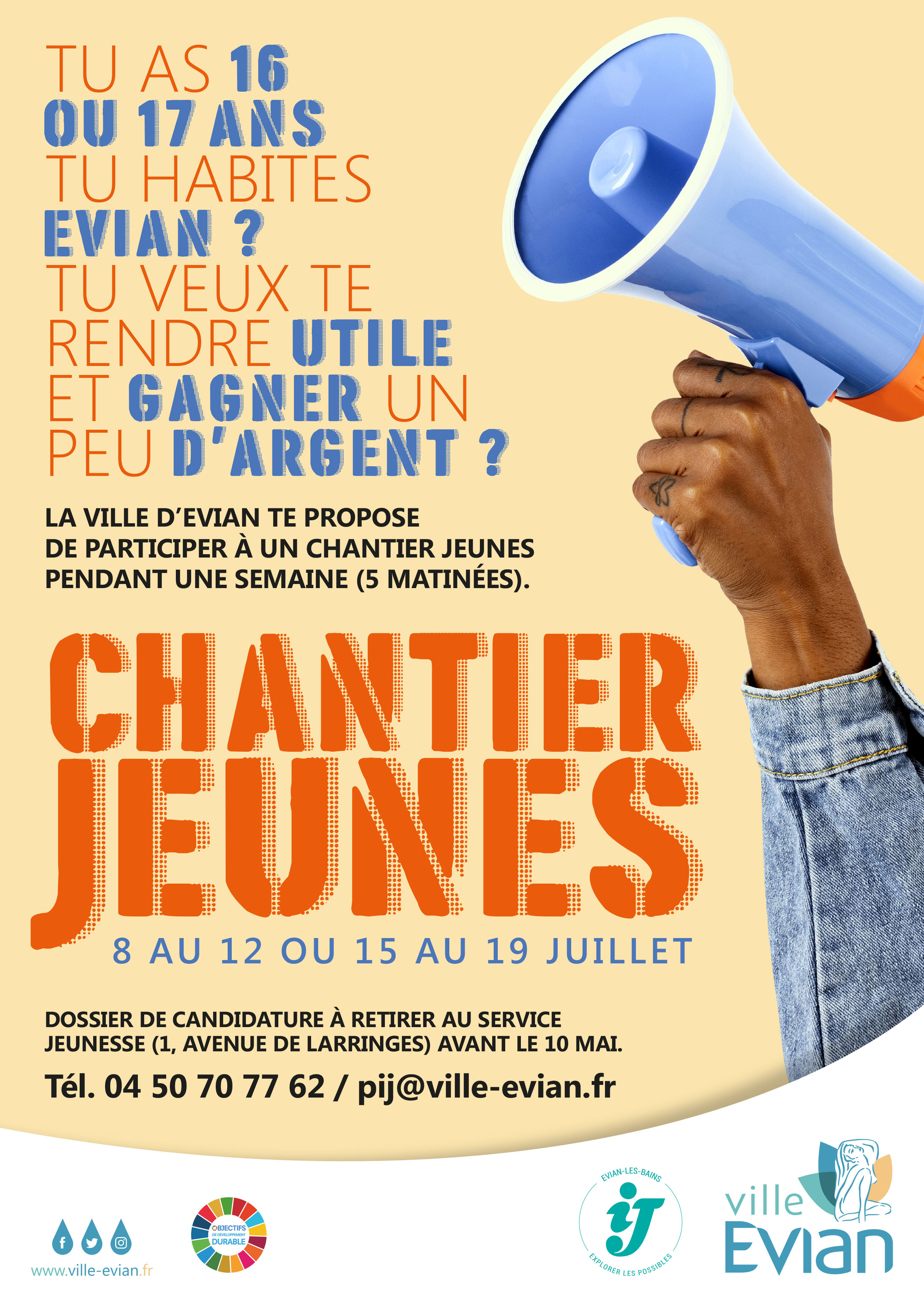 La ville d'Evian propose aux jeunes Eviannaises et Eviannais âgé(es) de 16 à 17 ans de participer cet été à deux chantiers jeunes du 8 au 12 juillet ou du 15 au 19 juillet.