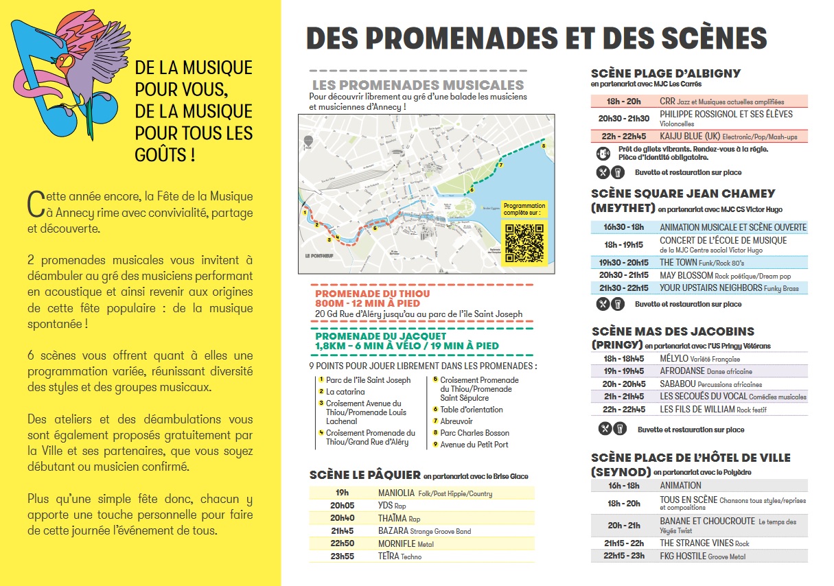 2 promenades musicales vous invitent à déambuler au gré des musiciens. 6 scènes vous offrent également une programmation variée, réunissant diversité des styles et des groupes musicaux.