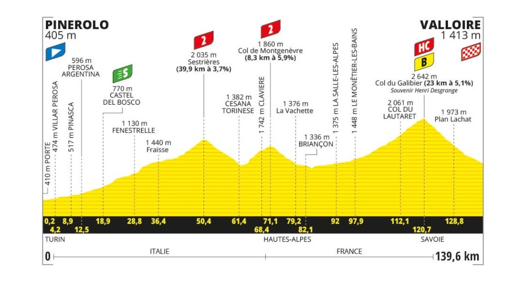 Après un début de course en Italie avec des étapes longues et plates, les coureurs s'attaquent à la montagne. Ils passeront par le col du Montgenèvre avant de grimper le col du Lautaret et de terminer par le célèbre col du Galibier à 2642 mètres d’altitude. Ce sera une première occasion pour les favoris de se tester en Haute-montagne.