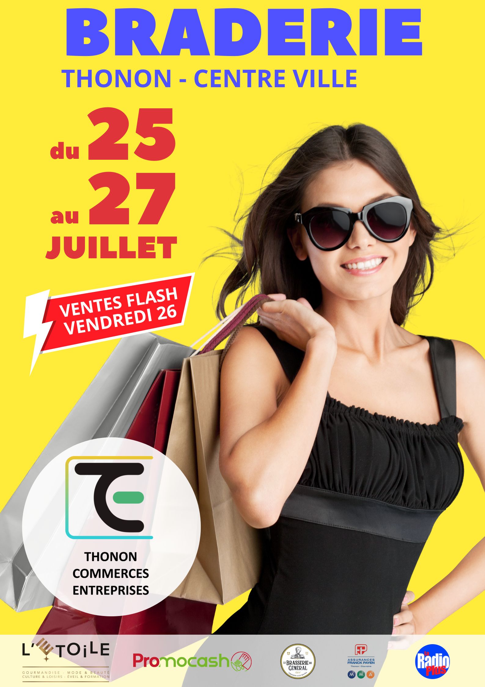 Traditionnel rendez-vous de la fin juillet, la grande braderie commerciale de Thonon sera animée vendredi 26 juillet par des ventes flash, promotions surprises de courte durée, dans une boutique et sur une certaine catégorie de marchandise, sur une marque, voire même sur l'ensemble du magasin. Le point d'animation sera disposé sur le square Aristide Briand, au coeur de la capitale du Chablais, où seront annoncées les ventes flash et où il sera possible de remporter des cadeaux offerts par les commerçants participants.