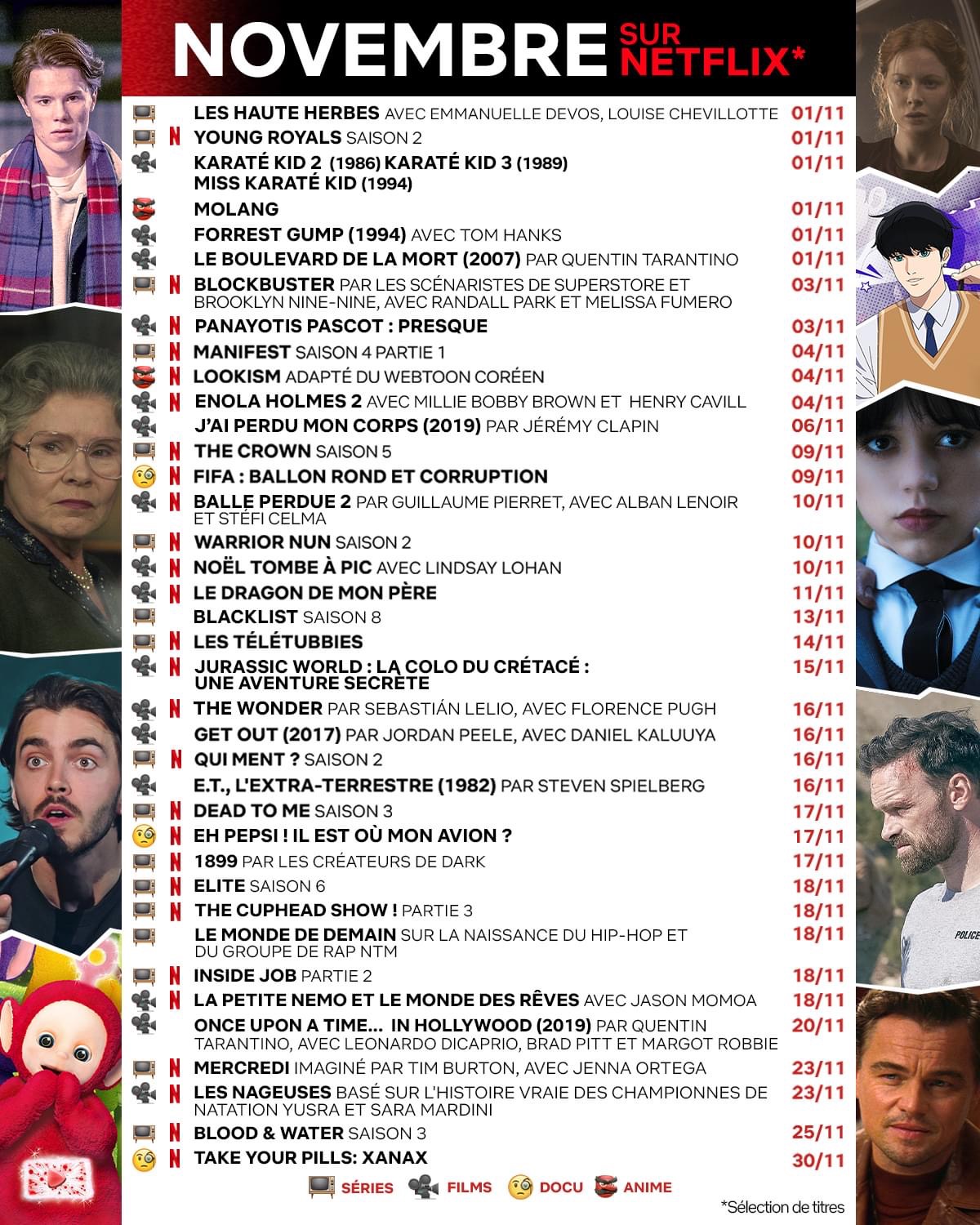 Pour le mois de novembre, ce sont les séries qui dominent les sorties avec notamment la première série signée par Tim Burton, Mercredi, mais aussi le retour de Manifest, de Dead to me, The Crown, Young Royals et Blacklist. En ce qui concerne les films, le réalisateur Quentin Tarantino est mis à l'honneur avec Once Upon a Time in Hollywood et Le Boulevard de la morttandis qu'un autre grand réalisateur, Steven Spielberg, voit son film culte E.T. intégrer la plateforme.